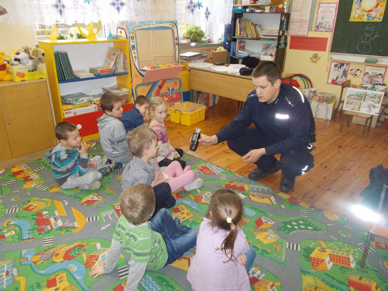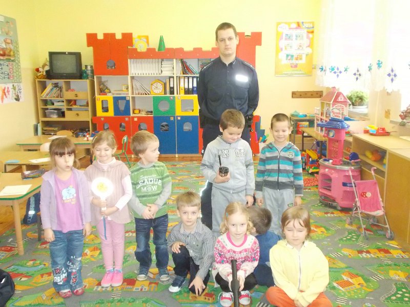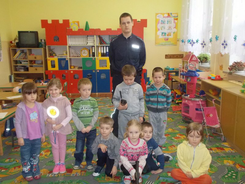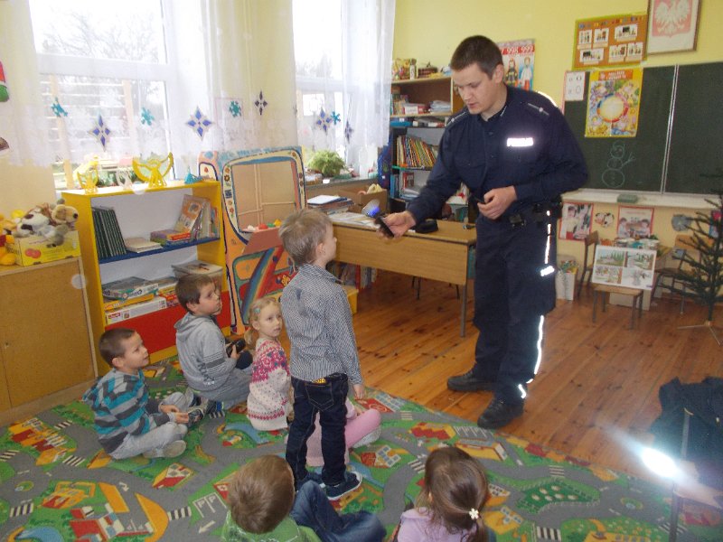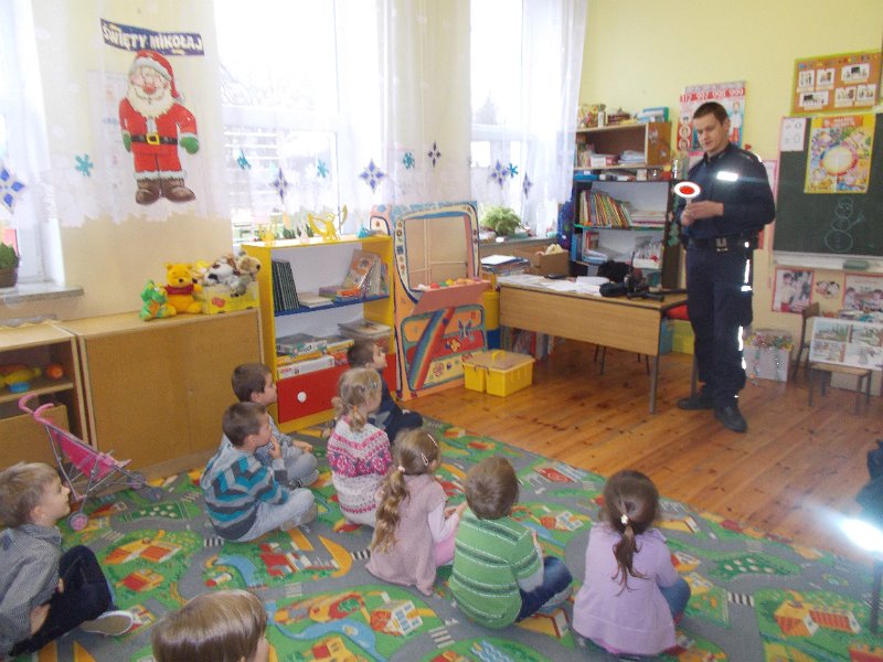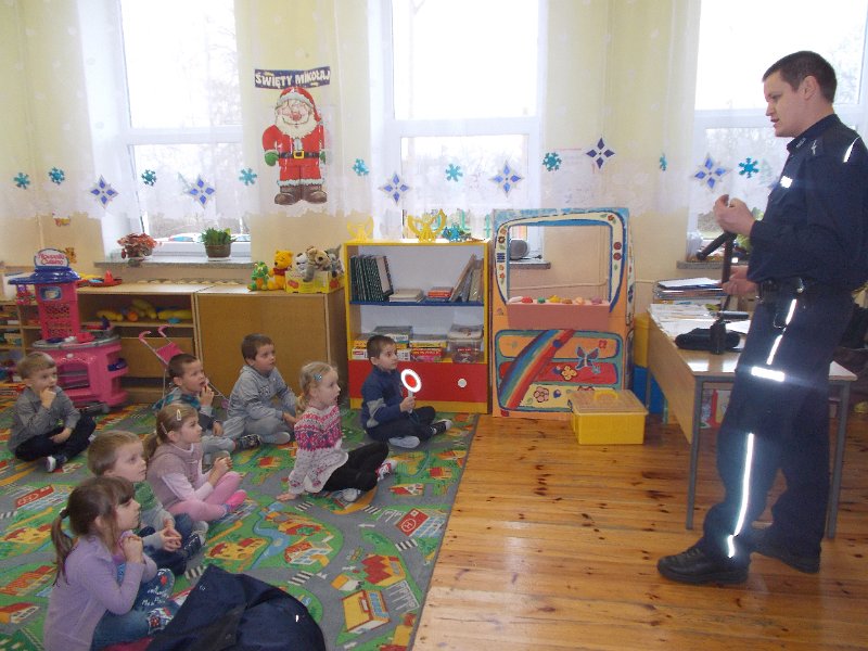 15.12.2014r. do oddziału przedszkolnego przyjechał z wizytą Pan Policjant z PP w Trzeszczanach - mł. asp. Jacek Wrzyszcz, który opowiadał o swojej pracy, jak również wygłosił pogadankę na temat bezpieczeństwa na drodze, w domu czy w szkole. Pan Policjant spotkał się też z uczniami klasy V.