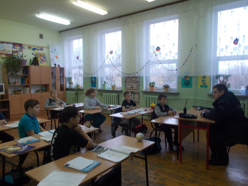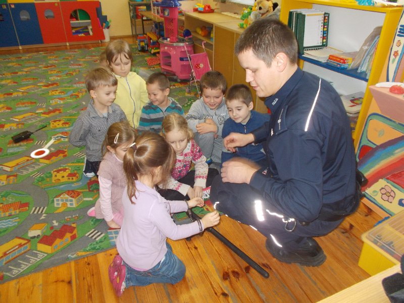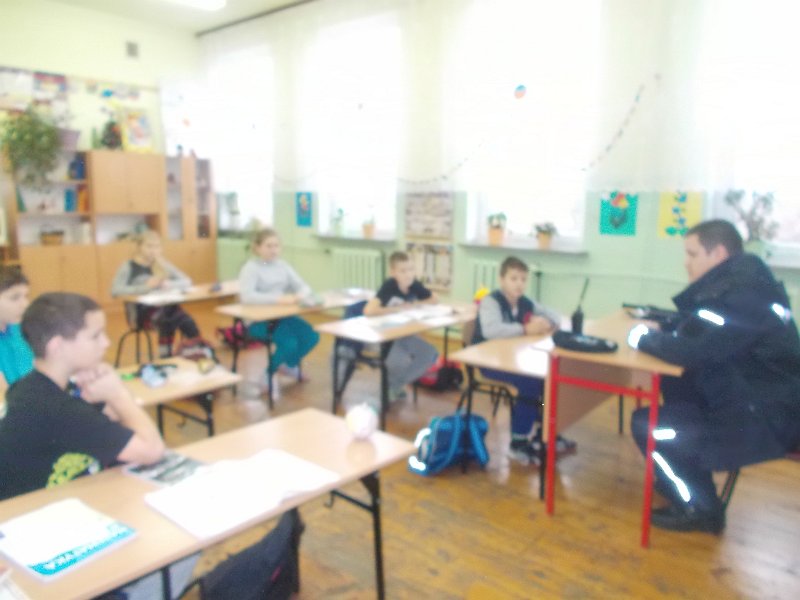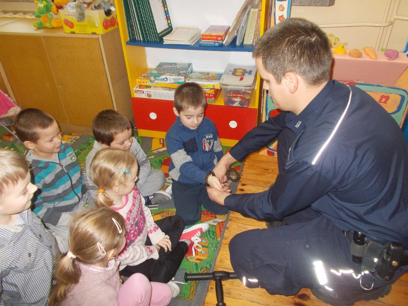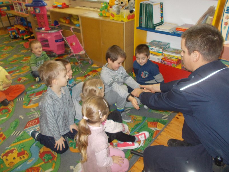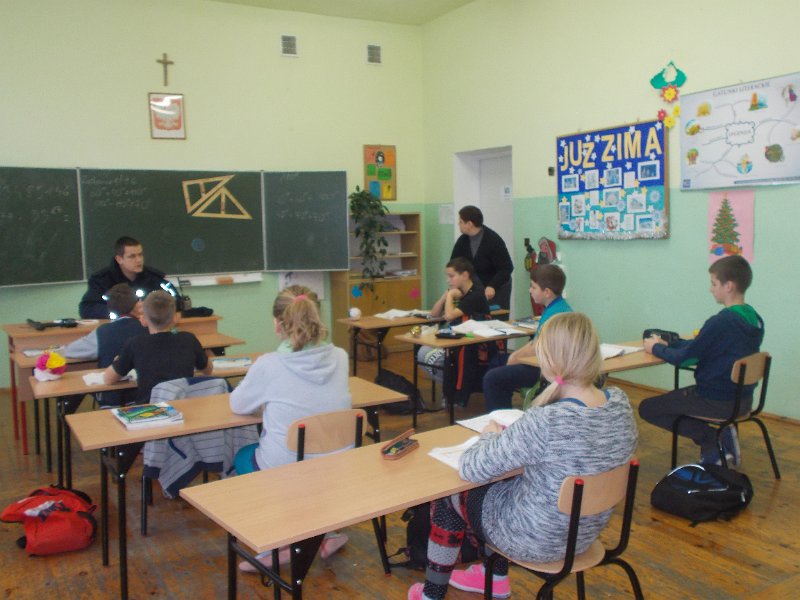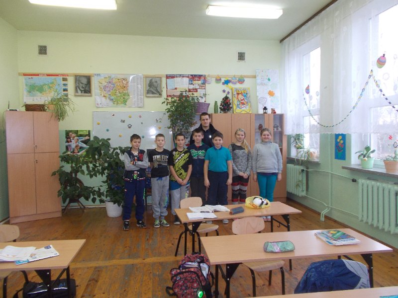 15.12.2014r. do oddziału przedszkolnego przyjechał z wizytą Pan Policjant z PP w Trzeszczanach - mł. asp. Jacek Wrzyszcz, który opowiadał o swojej pracy, jak również wygłosił pogadankę na temat bezpieczeństwa na drodze, w domu czy w szkole. Pan Policjant spotkał się też z uczniami klasy V.